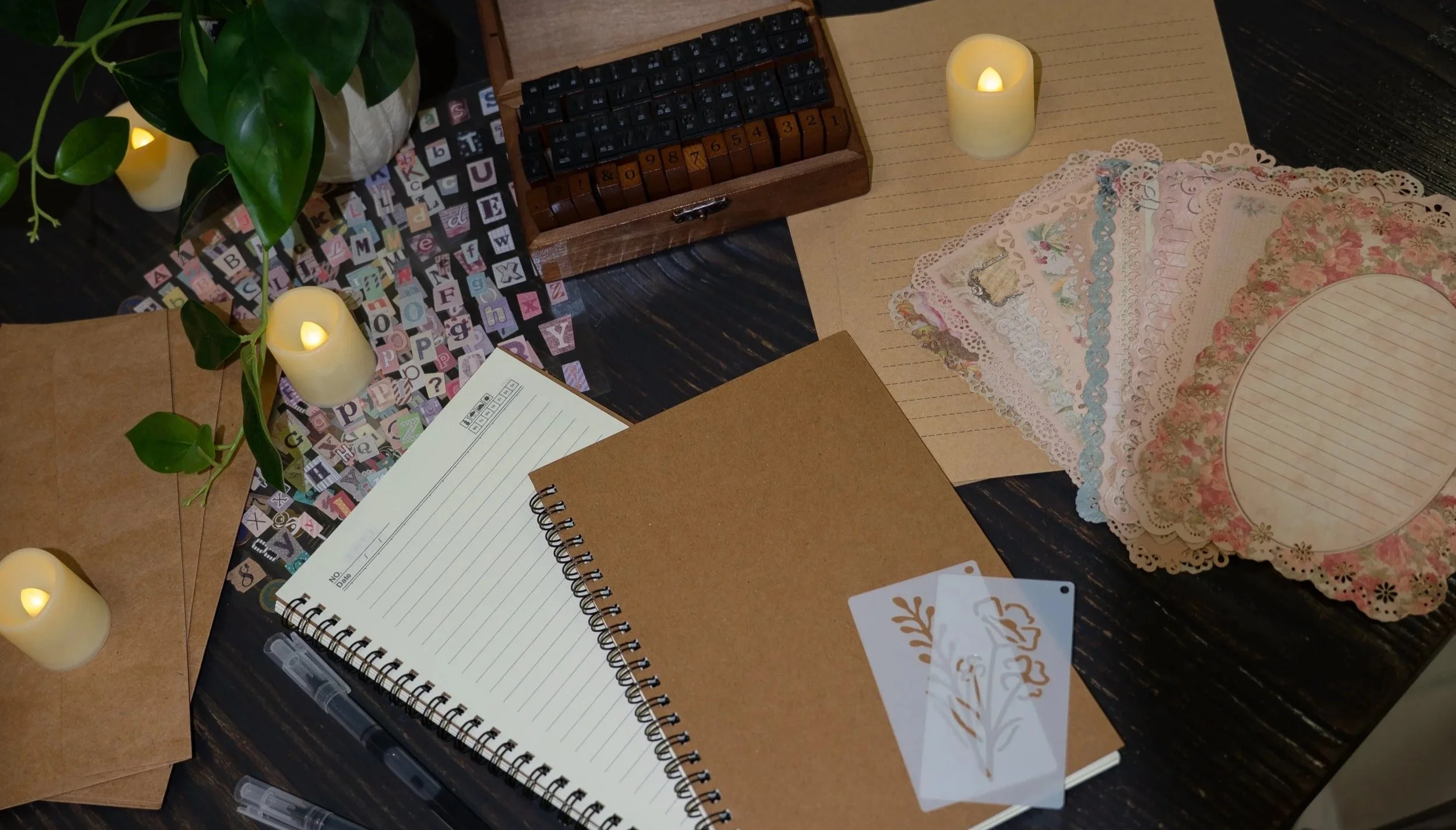 Customize a kraft cover notebook with our crafting bar stocked with stamps, stencils, stickers etc. as well as stationary to craft the sweetest love letters to yourself or loved one. (It’s encouraged to bring in polaroids or small photos to decorate with!)