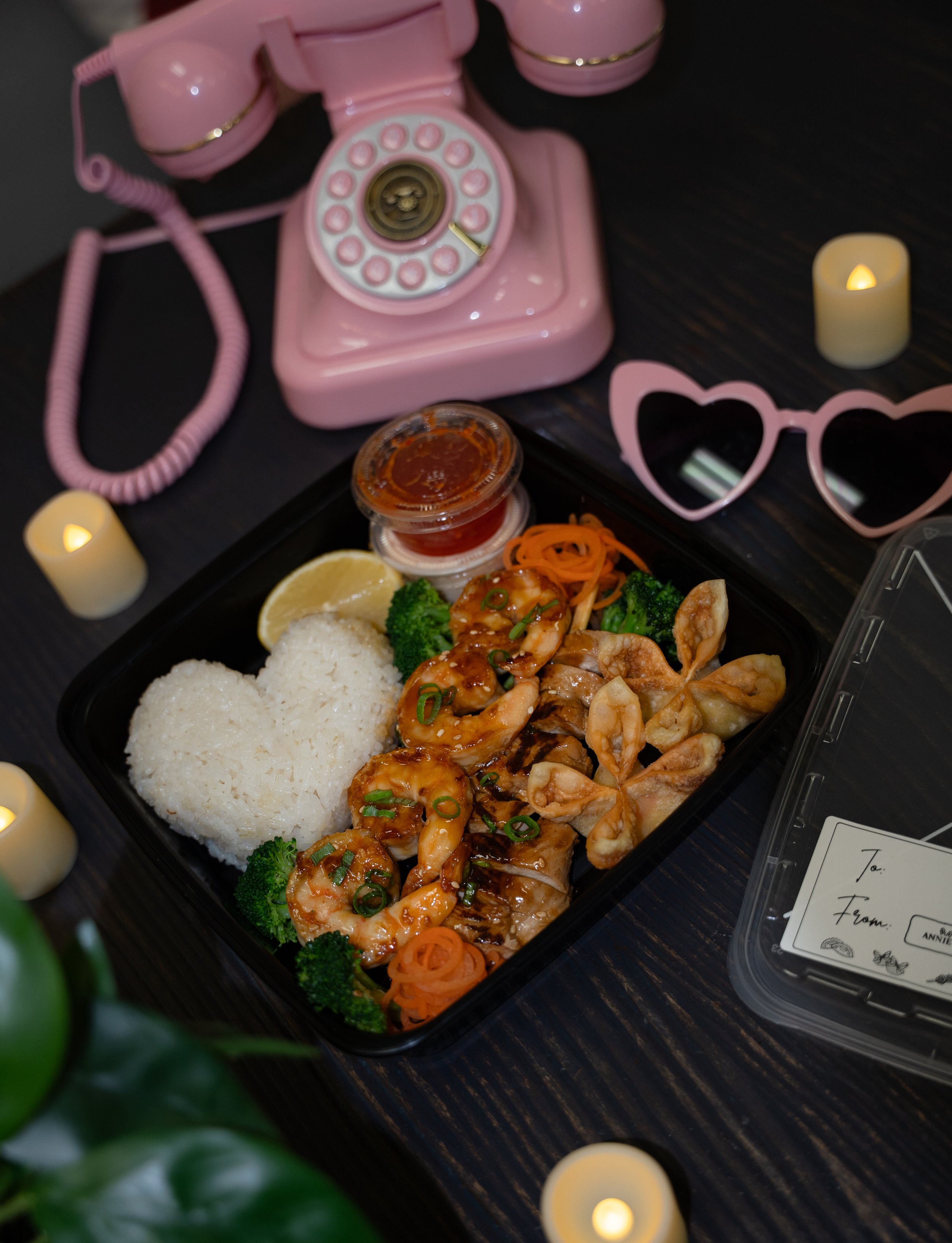Heart shaped white rice with grilled shrimp & chicken skewers & the choice of fried beef dumplings or crab rangoons